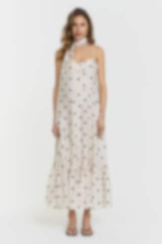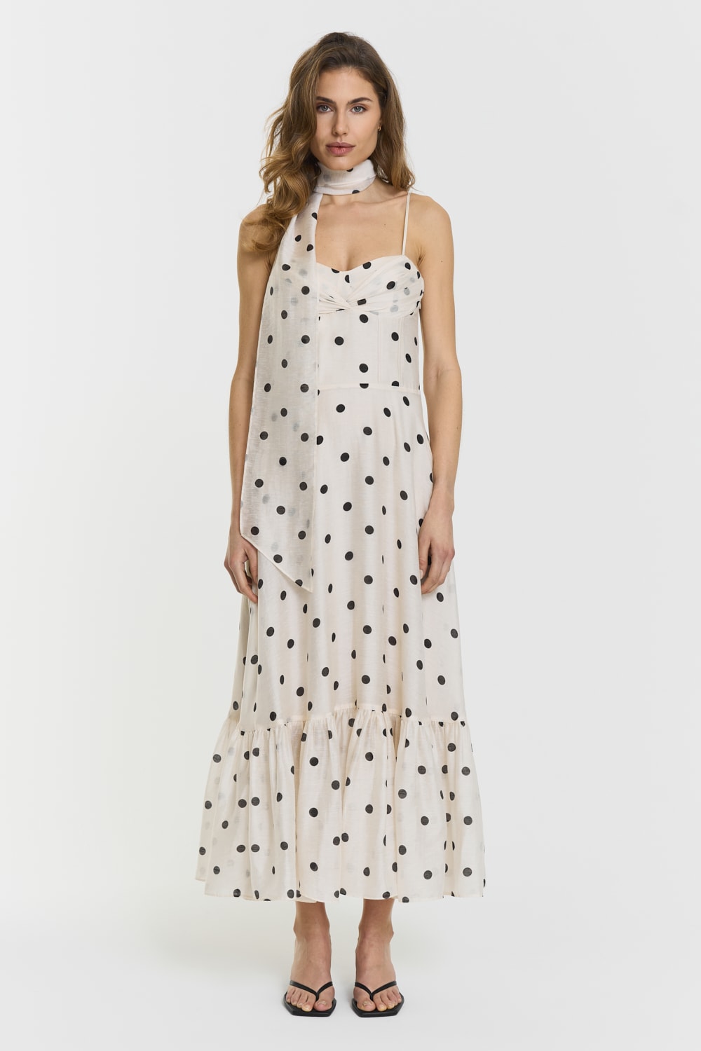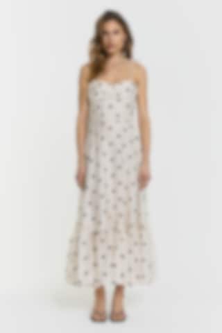 The Pennie Dress features a structured bodice with delicate boning and smocking at the back for a flexible fit. Adjustable straps and a flounced panel at the hem create a feminine silhouette. Fully lined with a hidden zip, it falls to a long midi length. Model is 176 cm tall and is wearing size 36.