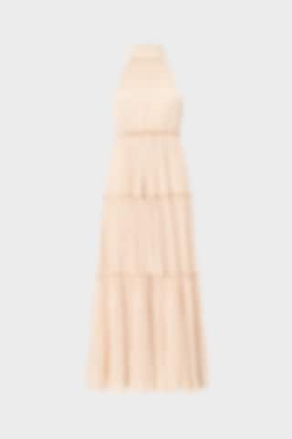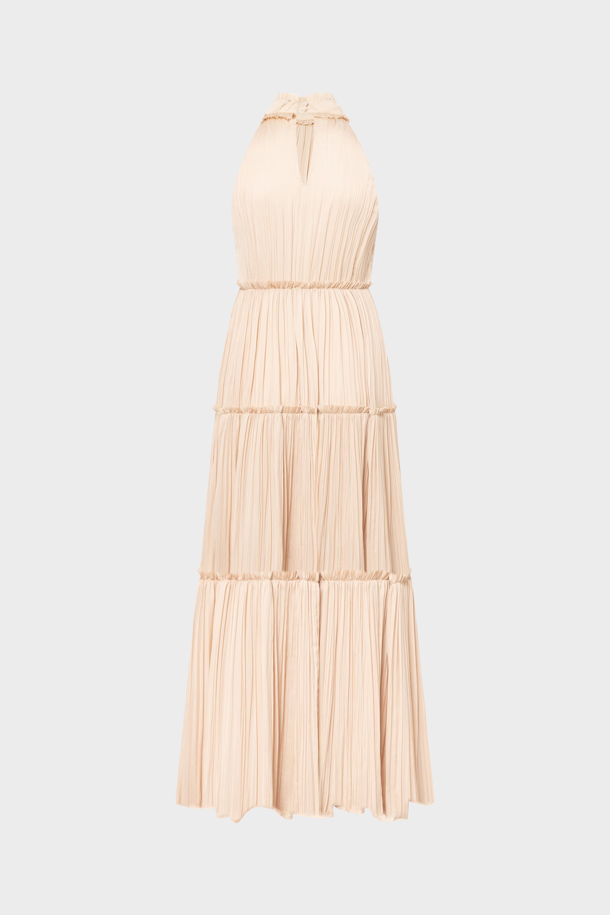 Launching in April. The Aster Dress is designed with a halter neckline and a softly tiered silhouette, enhanced by a subtle creased effect and delicate frill detailing. The back features a loop-and-button closure, complemented by a concealed side zip for a smooth fit. Falling to a graceful maxi length, it brings an effortless sense of ease to any occasion.