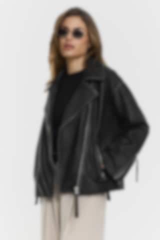 The Amari Leather Jacket has a subtly worn finish that gives it a refined, lived-in character. It features an oversized, boxy fit with zip closures at the front and sleeves, while the full lining adds structure and comfort.