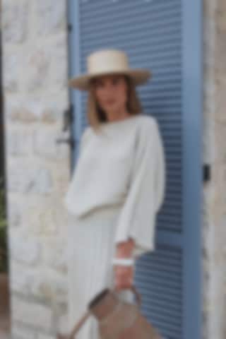 The Gaia Linen-Blend Sweater features a ribbed design, relaxed batwing sleeve, boat neckline, and rolled edges for a casual yet refined look. Knitted in a light beige melange linen blend with a ribbed texture, it pairs effortlessly with the matching Devyn Linen-Blend Skirt.
