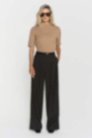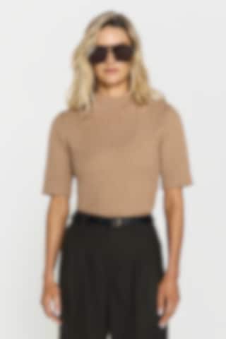 The model is 171 cm tall and is wearing size S. The Naila Knitted Top features short sleeves and a ribbed finish at the neck, sleeves and hem. Crafted from a mulesing-free merino wool.