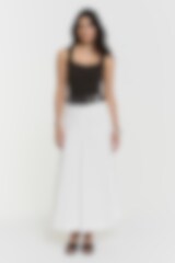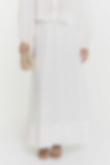 Marla is a blouse in cotton with an embroided fringy pattern. It has short puffy sleeves with cuffs and buttons, and opening at back with button.