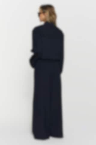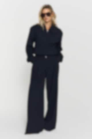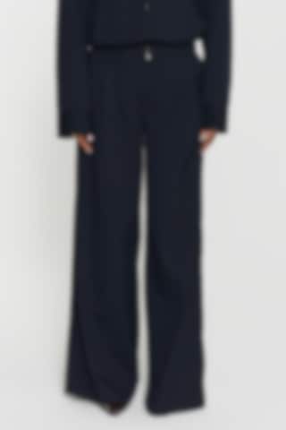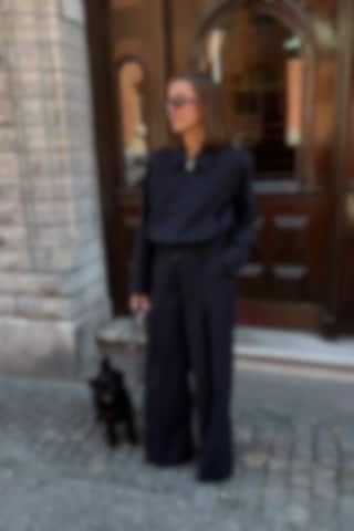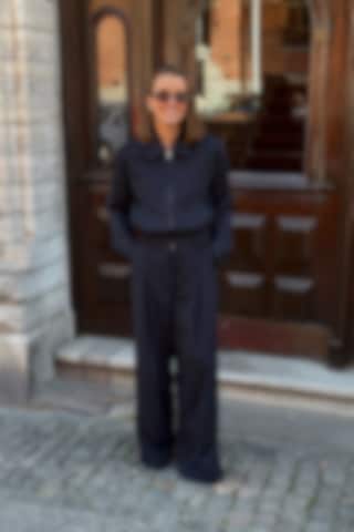 This style runs bigger in size. The model is 171 cm tall and wears size 36. The Destina Trousers feature a pinstriped design with a high waist, wide legs, front pleats, side pockets, and back welt pockets.