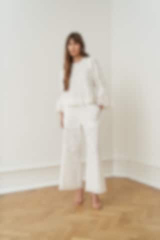 The Leonora Trousers in cotton features broderie anglaise embroidery, a half-lined design, a scalloped hem, two front pockets, and an elastic waistband, offering a comfortable and stylish. The model is 176 cm tall and wears size S/36. These pants tend to run large. For the best fit, we recommend sizing down.