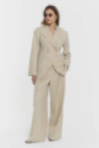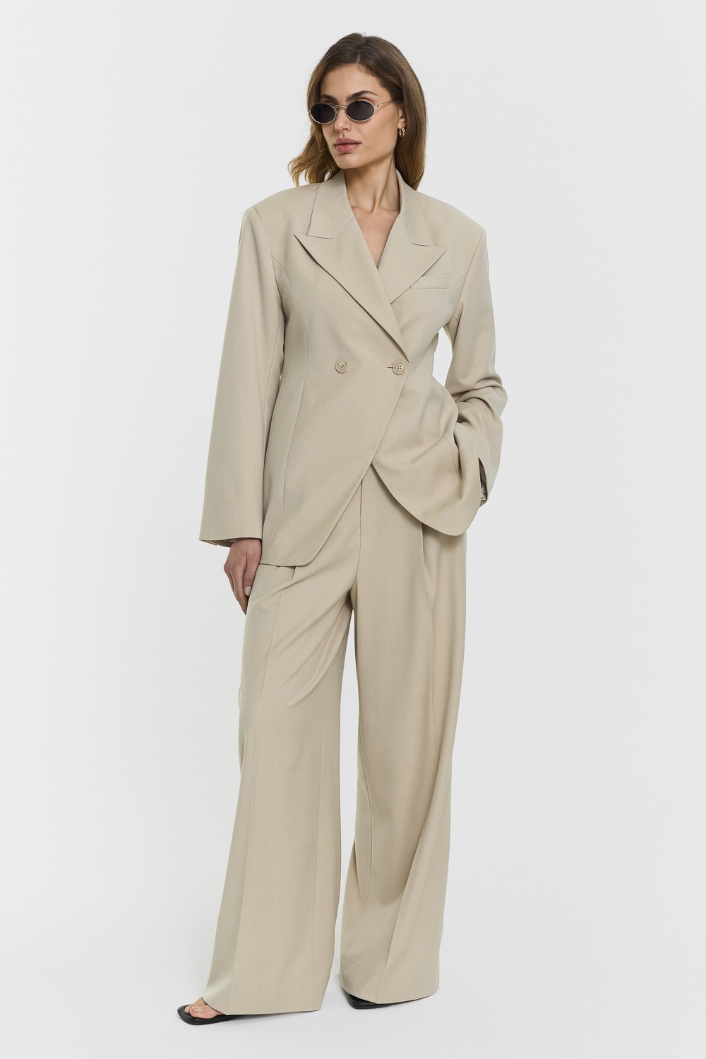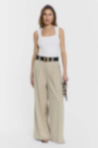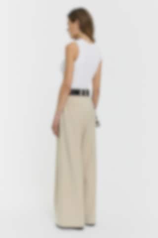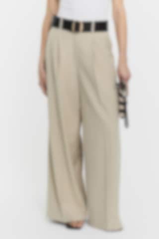 Introducing our Henny Trousers, tailored suit trousers with a high waist and a  wide leg. Defined by pressed pleats front and back. Finished with slanted side pockets, welt pockets at the back, and belt loops for an effortlessly refined look.