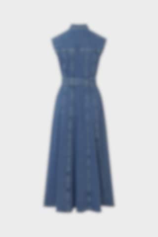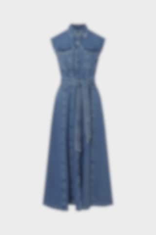 Explore casual chic with the Sinan Denim Dress. Crafted from 100% cotton, it features a sleeveless design, collar, and front button closure. The wider skirt with panels, two chest patch pockets, and a tie waist with belt loops in the back add flair, while two waist pockets enhance functionality.
