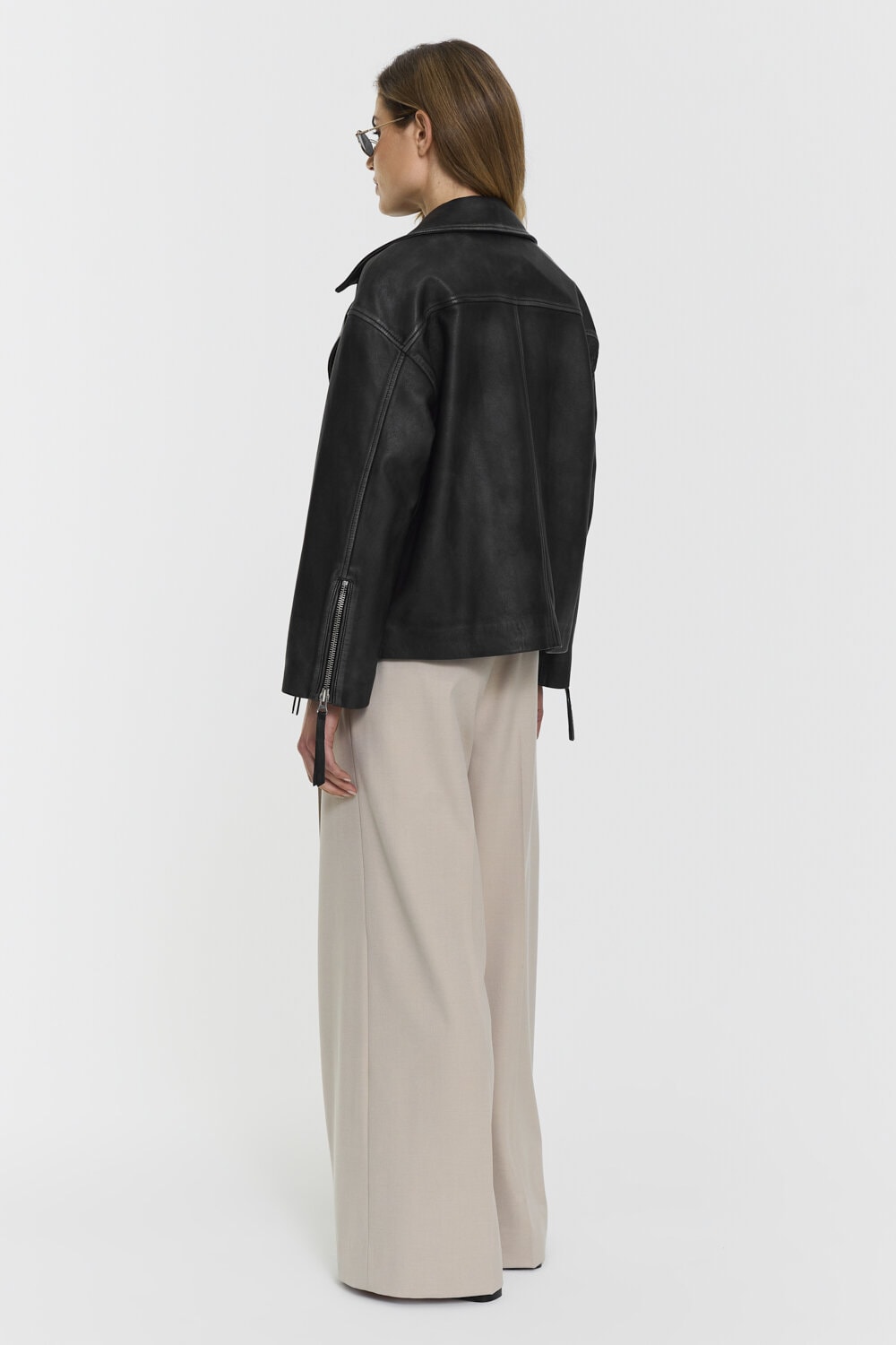 The Amari Leather Jacket has a subtly worn finish that gives it a refined, lived-in character. It features an oversized, boxy fit with zip closures at the front and sleeves, while the full lining adds structure and comfort.