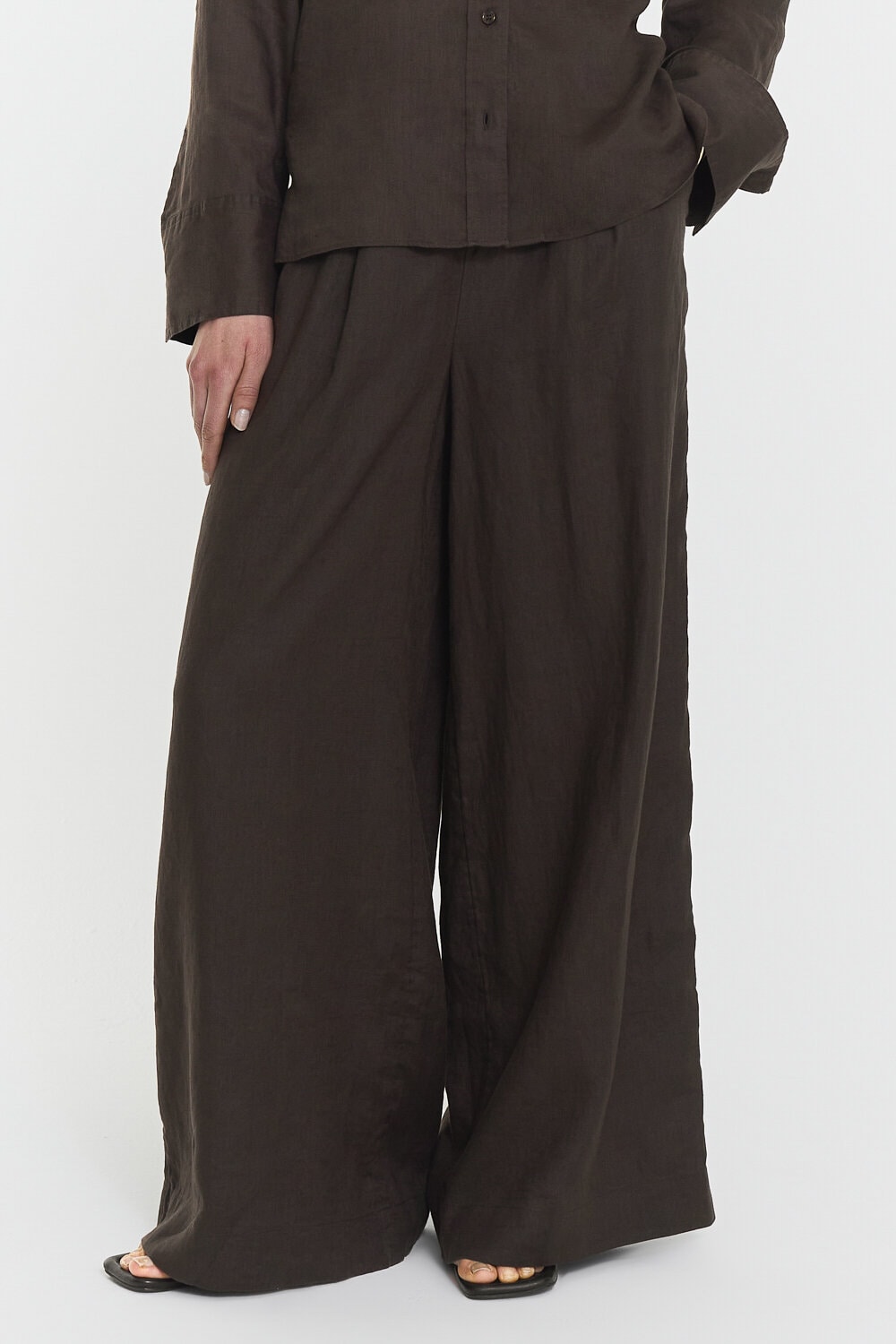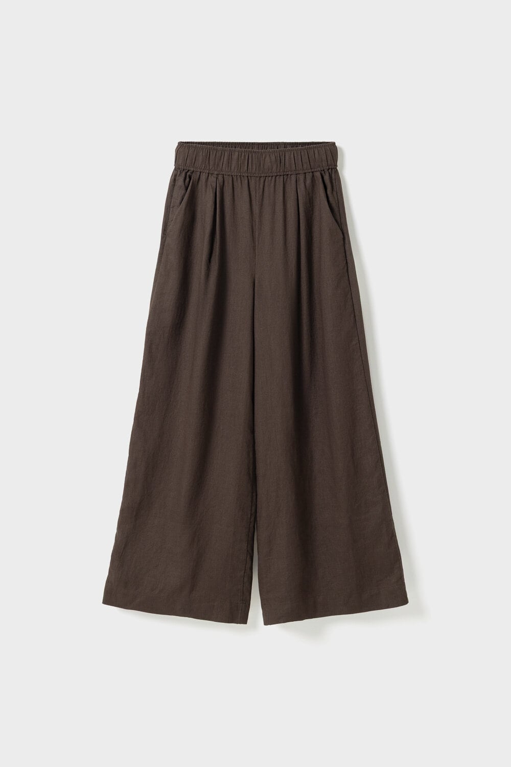 The Aprilia Linen Trousers are crafted from premium long-fiber linen, combining a soft touch with an effortless drape. The relaxed wide-leg shape and elastic high waist create an easy silhouette, completed with practical side pockets for everyday wear.