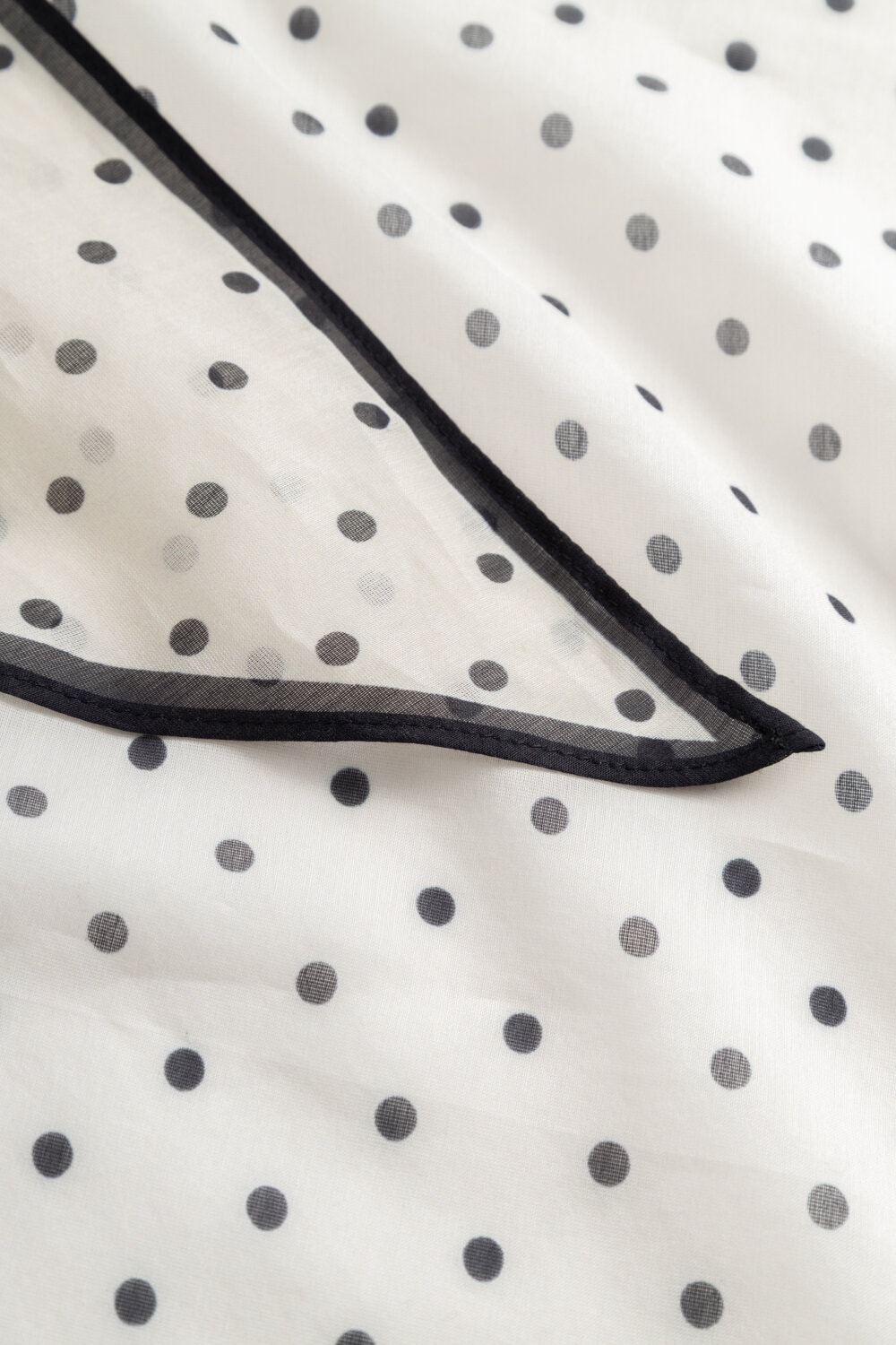 The Farina Silk-Blend Scarf features a white base adorned with fine black dots. Its light texture and soft drape lend an elegant, versatile touch to any look.
