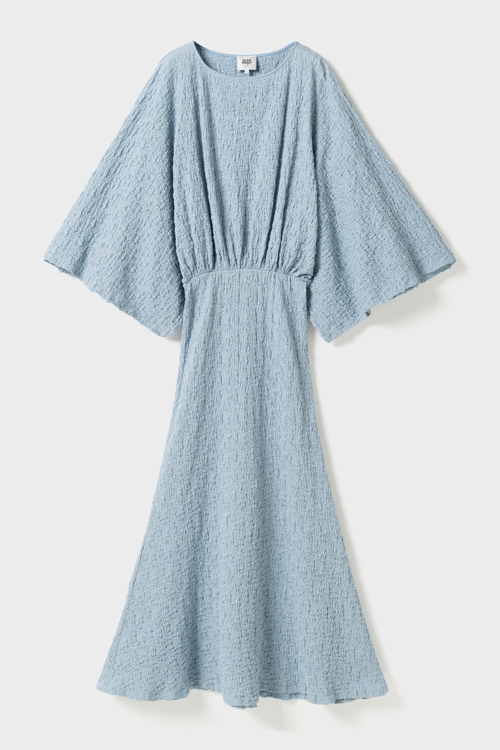 The Alessia Dress features a flattering inserted elastic waist, elegant wide sleeves, and a boat neckline. The creased texture adds a refined touch to the fluid silhouette. Model is 176 cm tall and is wearing size S.