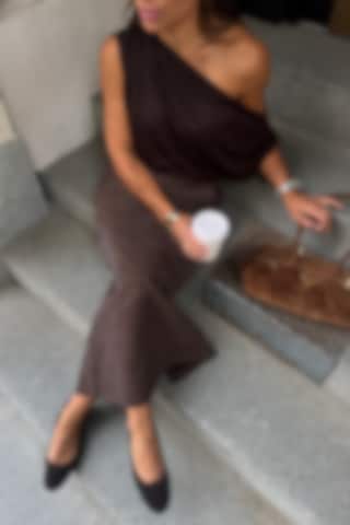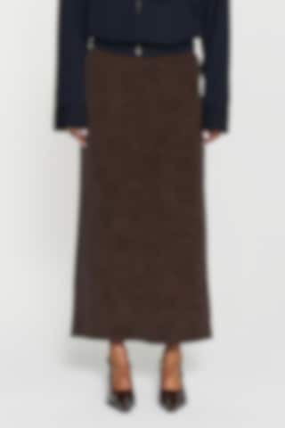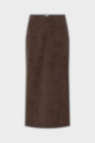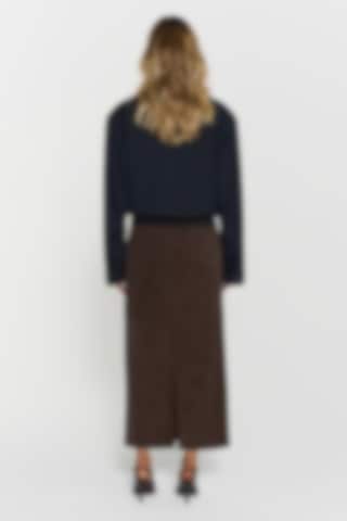 The model is 171 cm tall and wears size 36. Introducing our Yara Skirt: A sleek column design crafted from bio-based faux leather, midi length, featuring a hidden zip closure, slit back, and decorative running stitches.