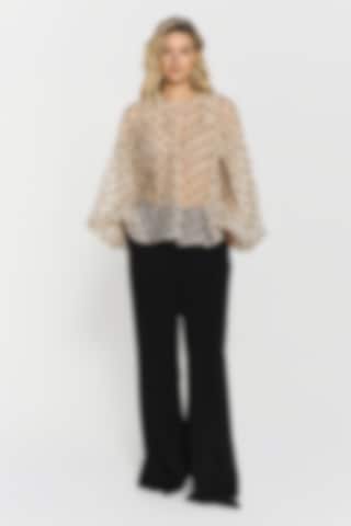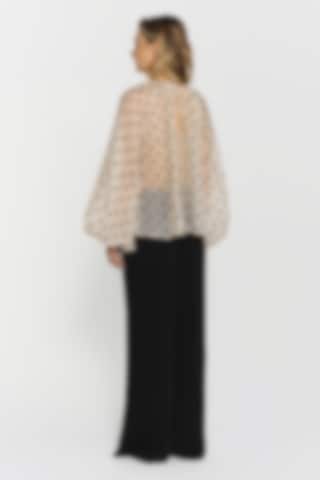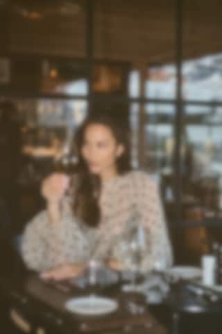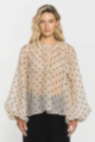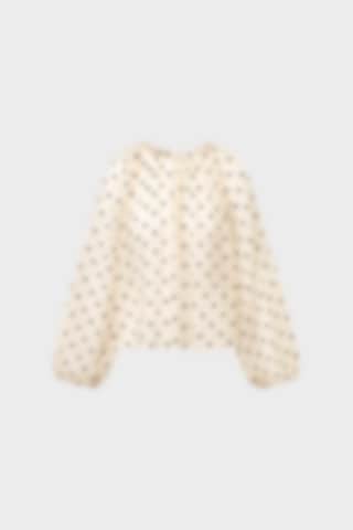 The model is wearing size S and is 171 cm long. The Alba Blouse is crafted from a soft lyocell blend with a creased texture and delicate velvet dots. Featuring voluminous balloon sleeves and a subtle button closure at the back neck, it’s effortlessly elegant.