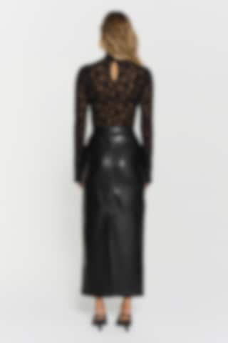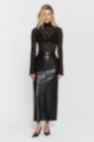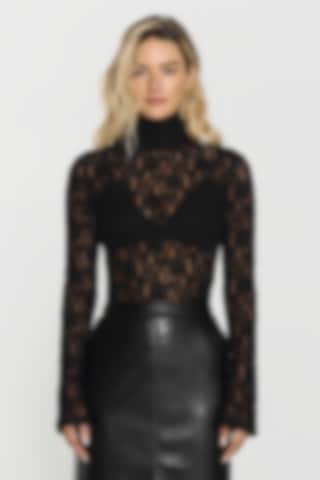 The model is 171 cm tall and wears size S. Introducing our Mariana Top: Exquisite delicate lace, adorned with a high neck and long sleeves, finished with a keyhole and button closure at the neck.