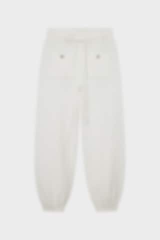 The model is 171 cm tall and wears size S. Sankt Moritz Knitted Trousers, made from bouclé yarn in a cozy wool blend, feature a drawstring waist, perfect for relaxed loungewear.