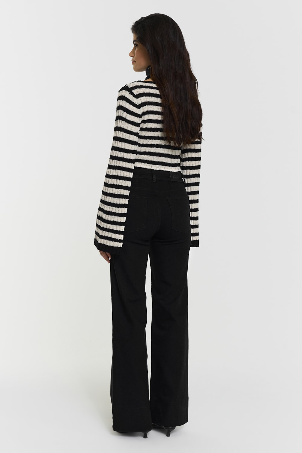 The model is 171 cm and wears size 27. Our Nora jeans feature a mid-rise waist, slim-fit and bootcut legs. Four pockets and belt loops. The popcorn effect fabric adds texture and personality.