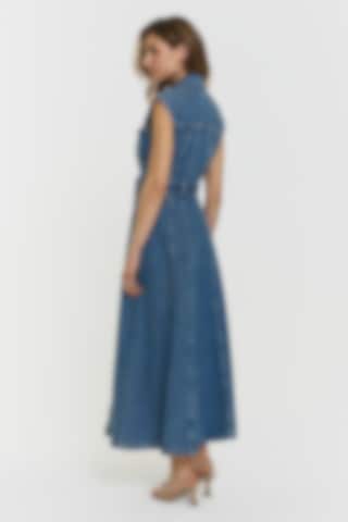 Explore casual chic with the Sinan Denim Dress. Crafted from 100% cotton, it features a sleeveless design, collar, and front button closure. The wider skirt with panels, two chest patch pockets, and a tie waist with belt loops in the back add flair, while two waist pockets enhance functionality.