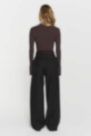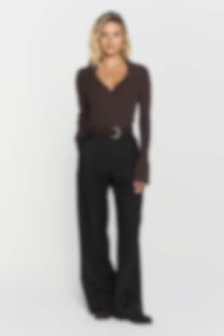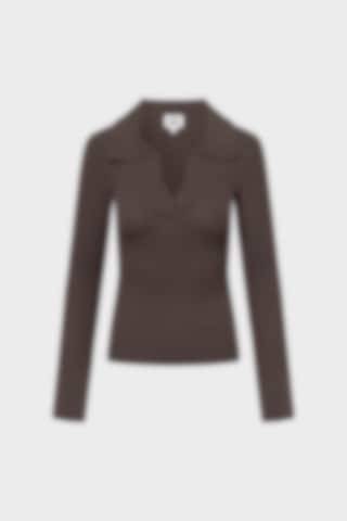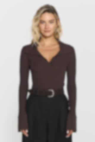 The model is 171 cm tall and wears size S. The Odyss Knitted Top features a ribbed design with a bold collar and detailed cuffs. Crafted from soft, elegant viscose för a refined style.