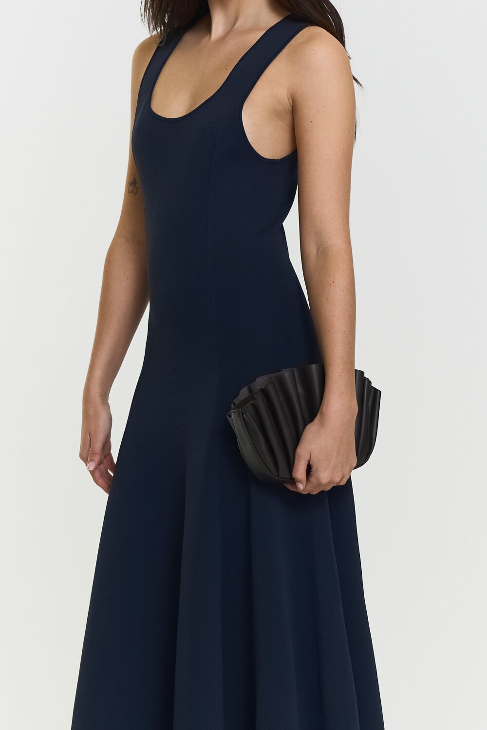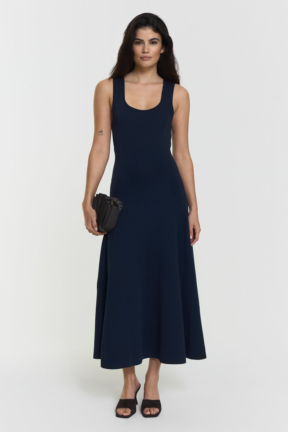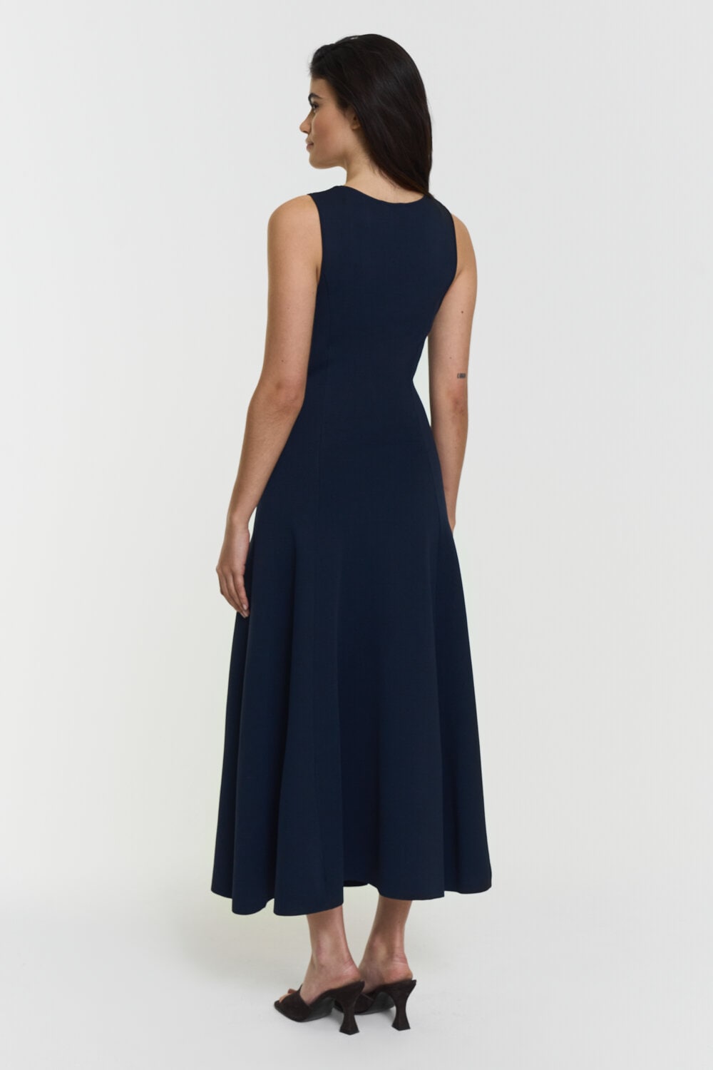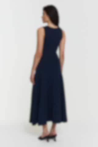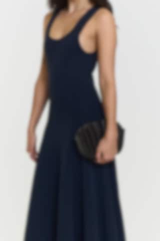 This knitted dress is designed with a fitted silhouette that flows into a subtle flare. The soft viscose-blend fabric offers a smooth, flexible feel, while the midi length adds an effortless sense of elegance.