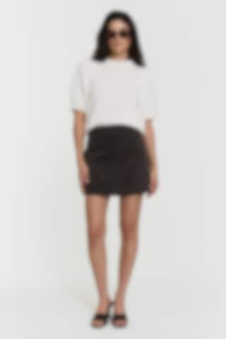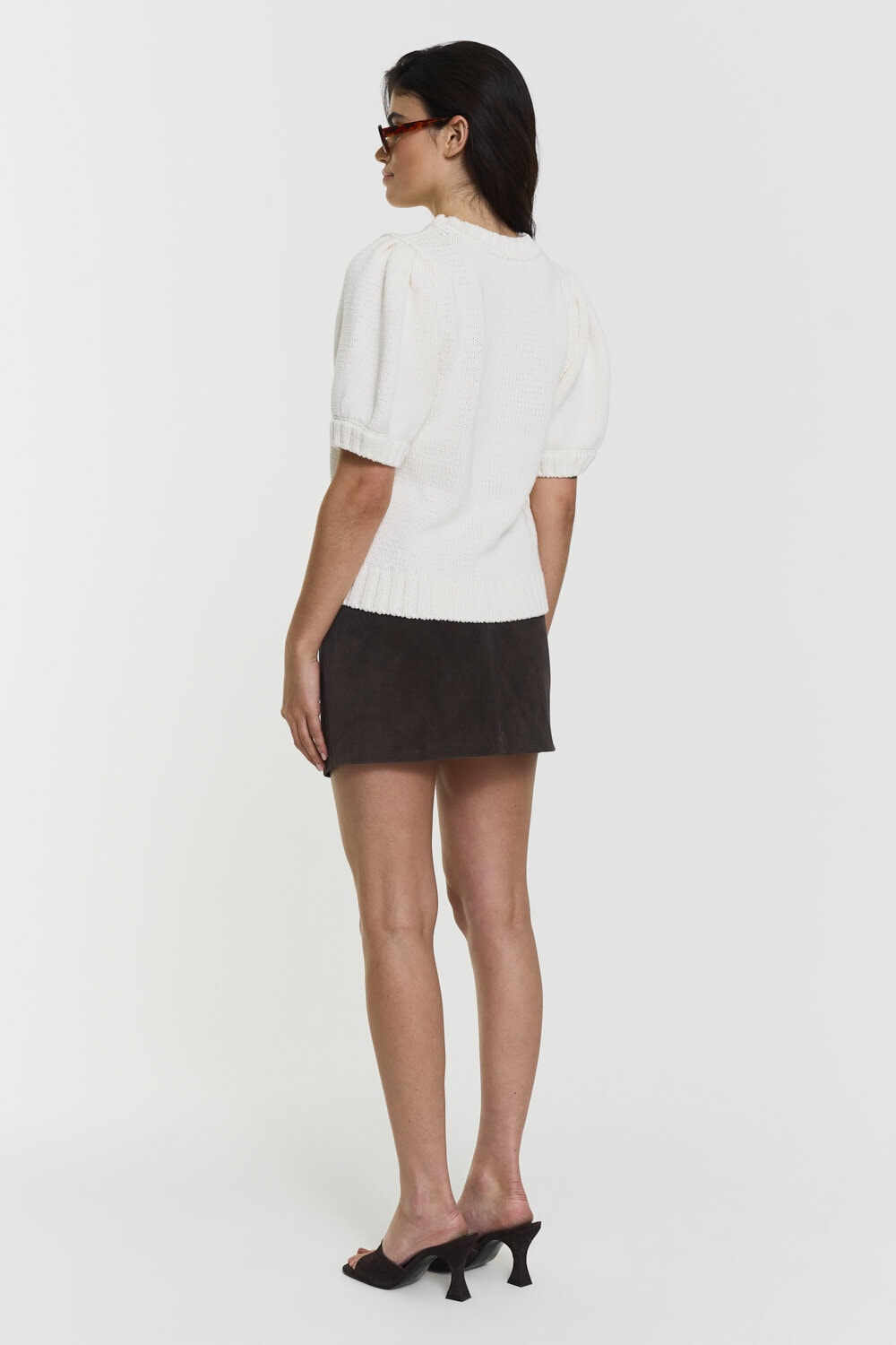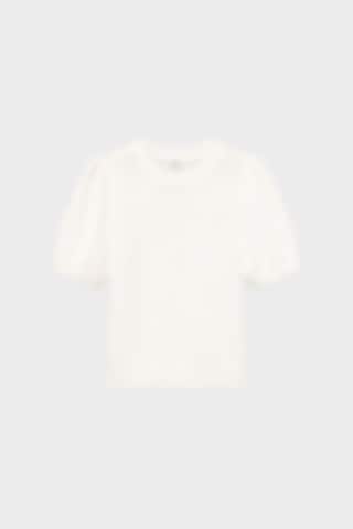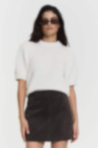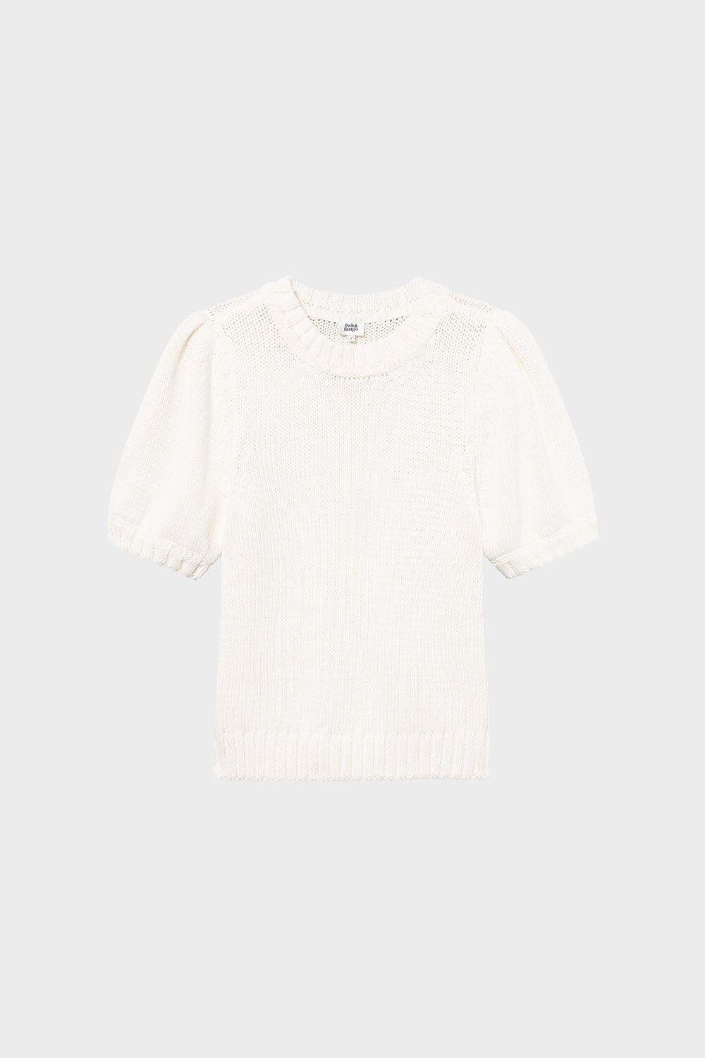The Iris Knitted Top features heavy organic cotton, stylish puff shoulders, short sleeves, and a rounded neckline for a chic, comfortable look.