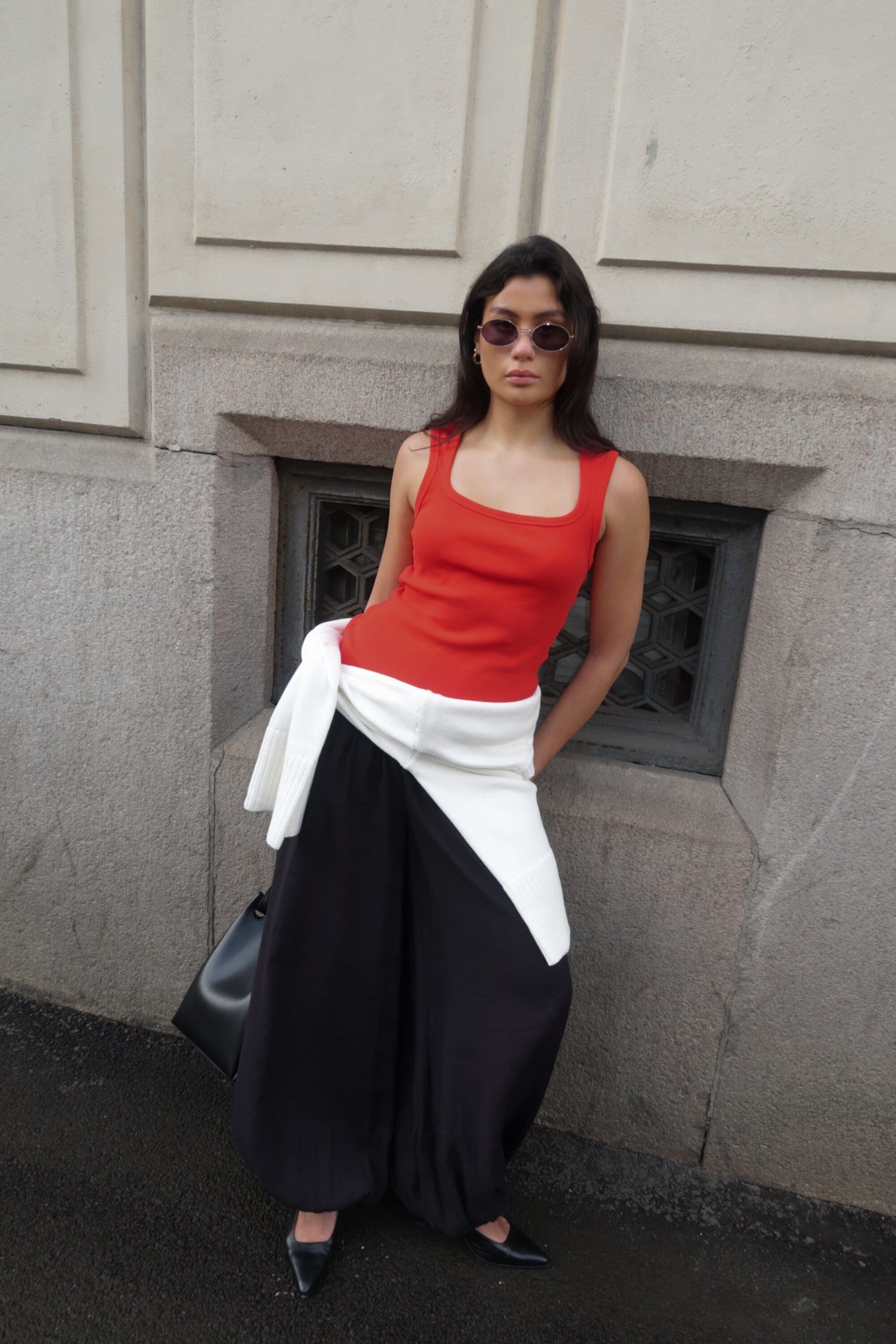 These balloon trousers have a relaxed, mid-waist fit. Designed with an elastic waistband and elastic cuffs for shape and ease, they feature side pockets and a softly draping fabric that moves effortlessly.
