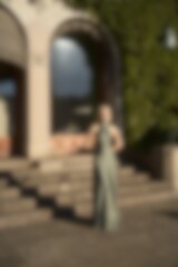 The Anemone Dress is designed with a sleek, elongated silhouette and a high draped neckline. The clean, sleeveless cut enhances its fluid shape, creating an elegant and understated expression.