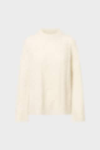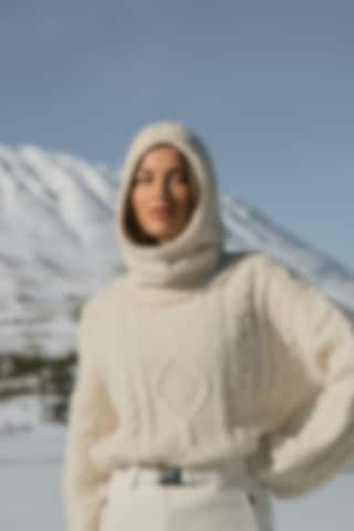 The model is 171 cm tall and wears size S. The Carole Cable-Knit Sweater is crafted from a soft wool-blend boucle yarn, offering texture and warmth. Designed with a rounded neckline, ribbed trims, and an oversized fit, it delivers effortless comfort and timeless winter style.