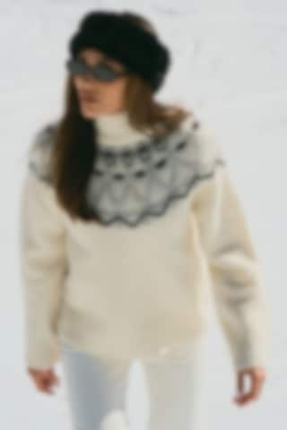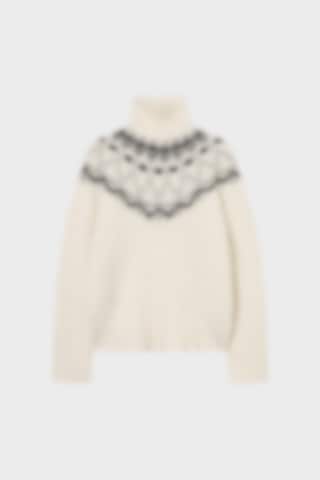 The model is 171 cm tall and wears size S. The Champoluc Knitted Sweater showcases a regular fit with a charming fair Isle motif, crafted from a soft alpaca blend and featuring a cozy turtleneck.