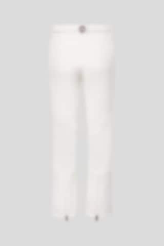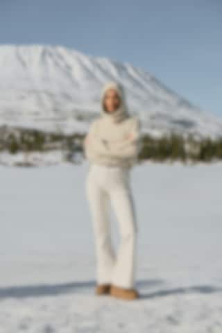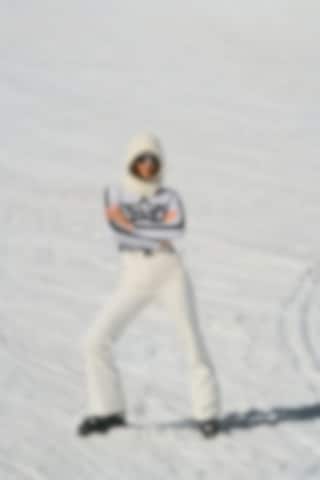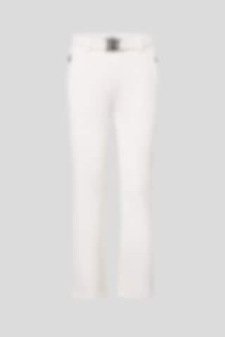 The model is 171 cm tall and wears size S. The Courchevel Outdoor Trousers feature an elastic belt, zip closure, and fleece-backed, four-way stretch polyester for enhanced ski performance. With 3000mm water resistance and 3000g/m²/24h breathability, they ensure warmth. Designed to be worn with light layers, size up for heavier layering.