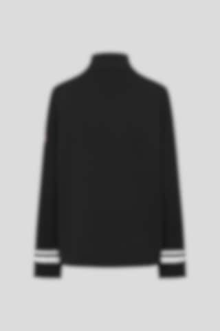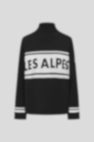 The model is 171 cm tall and wears size S. The Les Alpes Knitted Sweater offers a regular fit in soft merino wool, featuring a cozy high neck and a stylish ski patch.