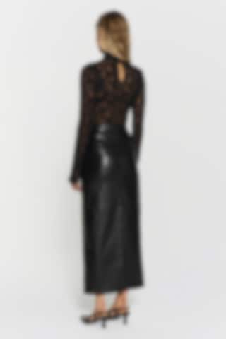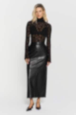 The model is 171 cm tall and wears size 36. Introducing our Yara Skirt: A sleek column design crafted from bio-based faux leather, midi length, featuring a hidden zip closure, slit back, and decorative running stitches.