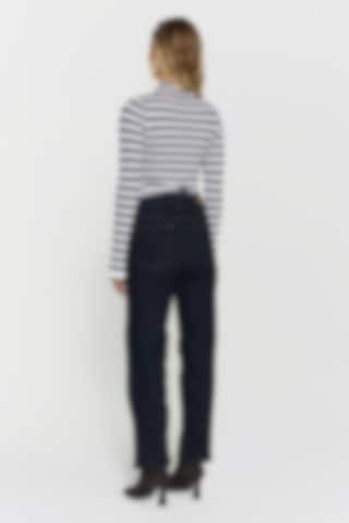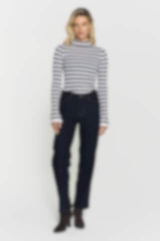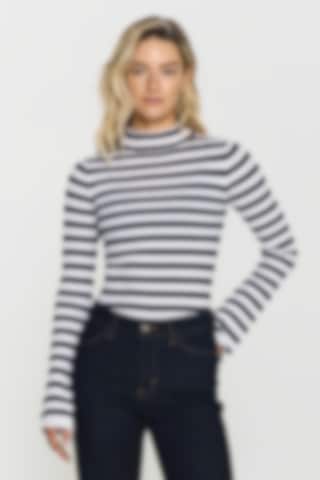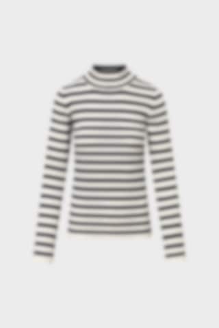 The model is 171 cm tall and wears size S. The Ingrid Knitted Sweater is crafted from soft extra fine merino wool, offering comfort and warmth. Designed with a ribbed, striped pattern, it combines timeless style with a modern touch, perfect for versatile everyday wear.
