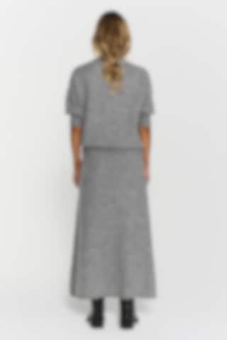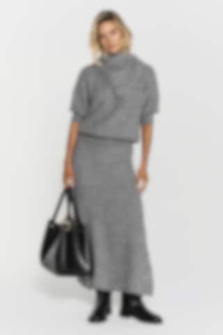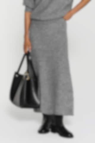 The model is 171 cm tall and wears size S. Introducing our Israa Knitted Skirt, crafted from a superfine alpaca blend, offering a flattering midi length with a ribbed elastic waistband. Pair with our Madina Short Sleeve Knit for the complete look.