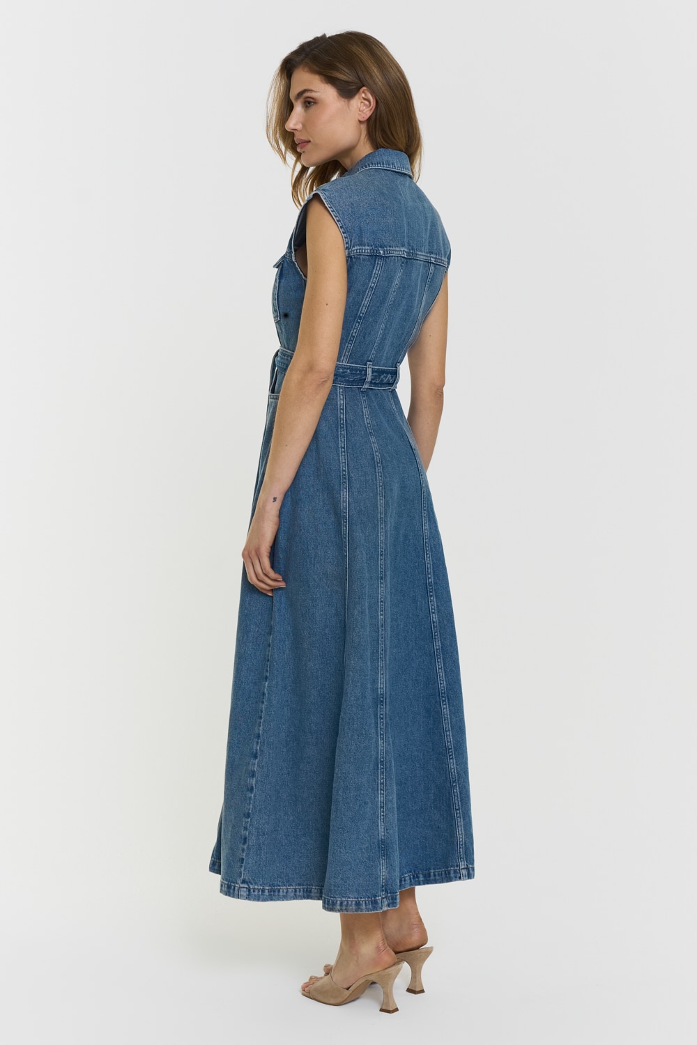 Explore casual chic with the Sinan Denim Dress. Crafted from 100% cotton, it features a sleeveless design, collar, and front button closure. The wider skirt with panels, two chest patch pockets, and a tie waist with belt loops in the back add flair, while two waist pockets enhance functionality.