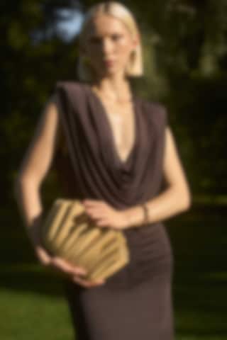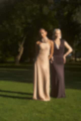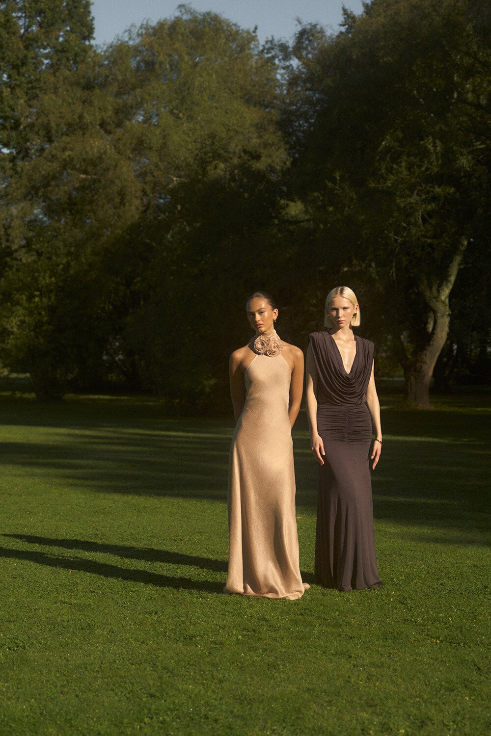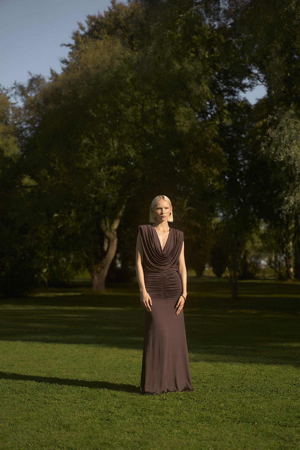 Launching in April. The Jonquil Dress is crafted in a stretchy jersey with elegant draping through the neckline and bodice, creating a soft, sculpted silhouette. Gathered detailing at the waist adds gentle structure, while a concealed back zip ensures a smooth fit. Finished with removable shoulder pads, the design balances definition with a fluid, maxi-length shape. Delivered in a full-length polybag with hanger.