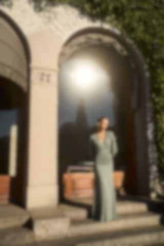 Launching in April. The Kamelia Dress is crafted in a stretchy jersey that drapes elegantly across the body, creating a sculpted silhouette through the bodice and hip. A hidden hook defines the V-neckline, while a concealed back zip ensures a smooth fit. Finished with removable shoulder pads, the long sleeves add refined structure to the fluid, maxi-length shape.