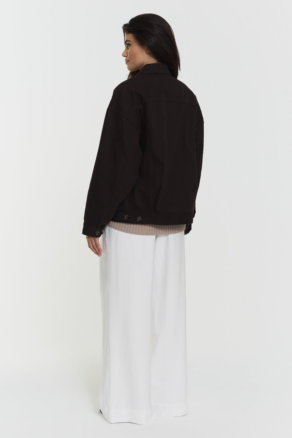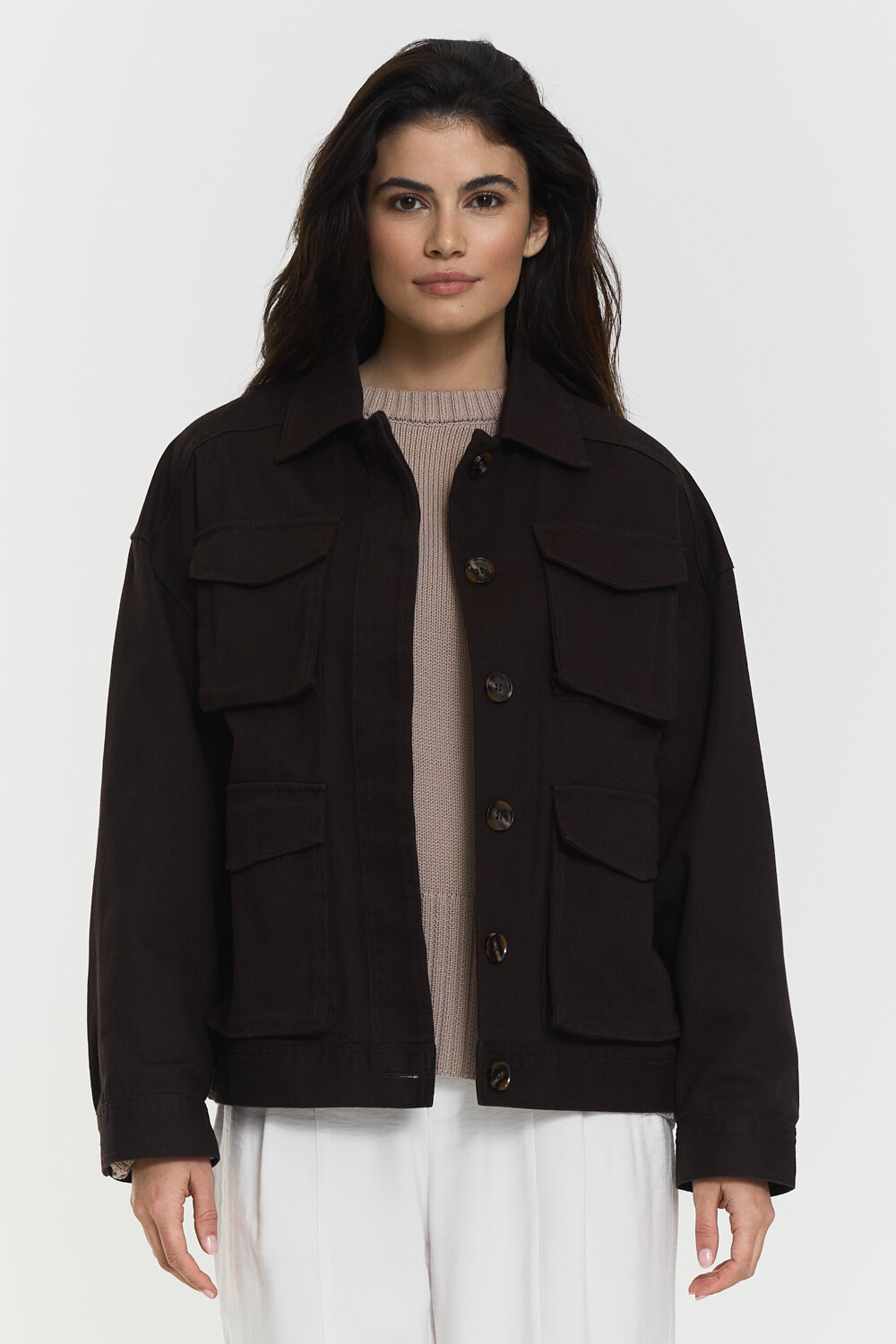The Zelda Jacket, expertly crafted from hard-wearing cotton-twill. It has an oversized fit, big patch pockets, adjustable flaps in sides, and a classic cuff at the sleeve end.