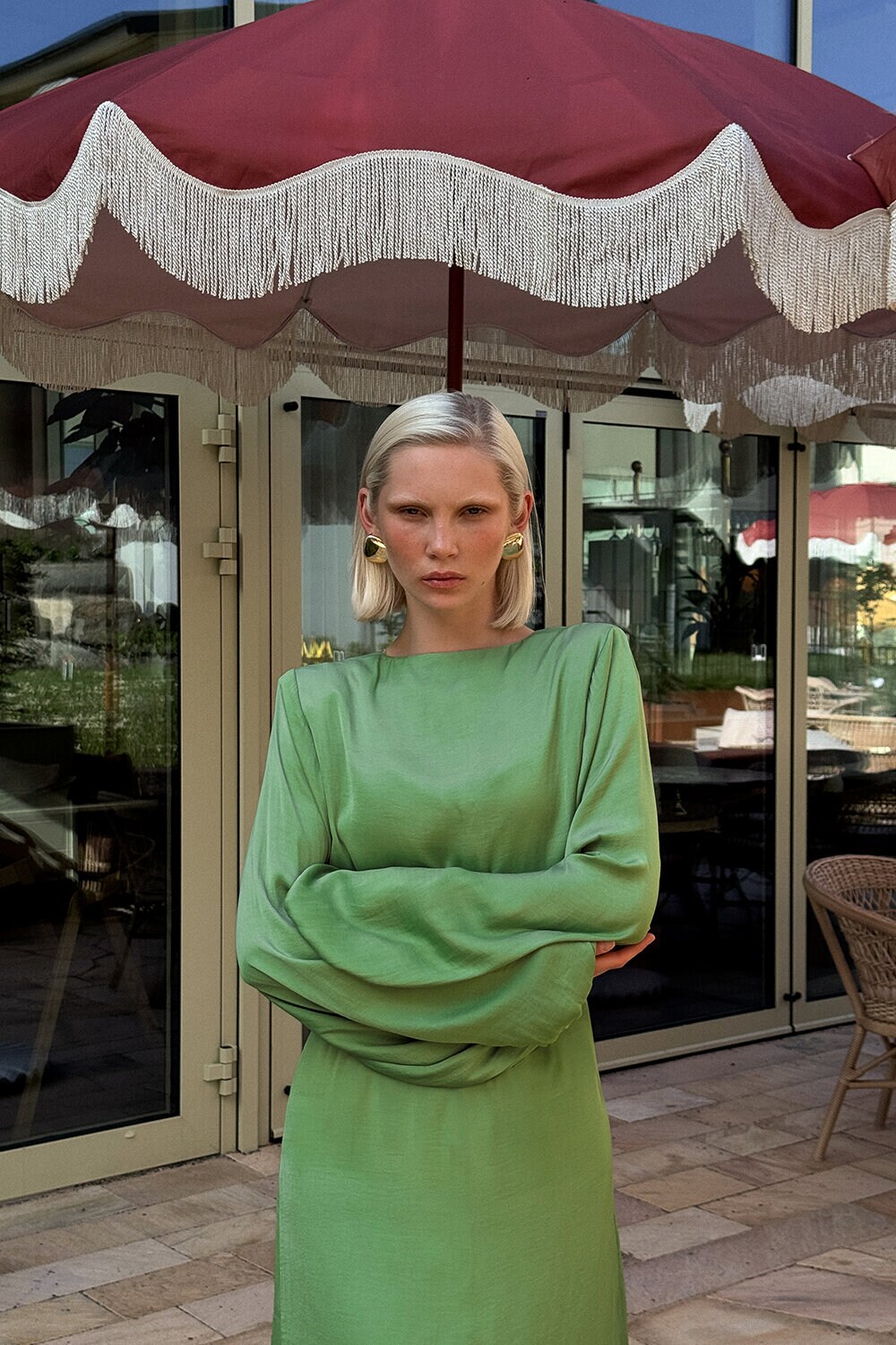 Note: This style has a longer fit and was designed with extra length. The Juliette Dress is designed in a fluid fabric with a graceful maxi silhouette. It features balloon sleeves with elastic cuffs, an overlapping back with a delicate tie at the neck, an elastic panel at the back, and a hidden zip. Fully lined for a refined finish.