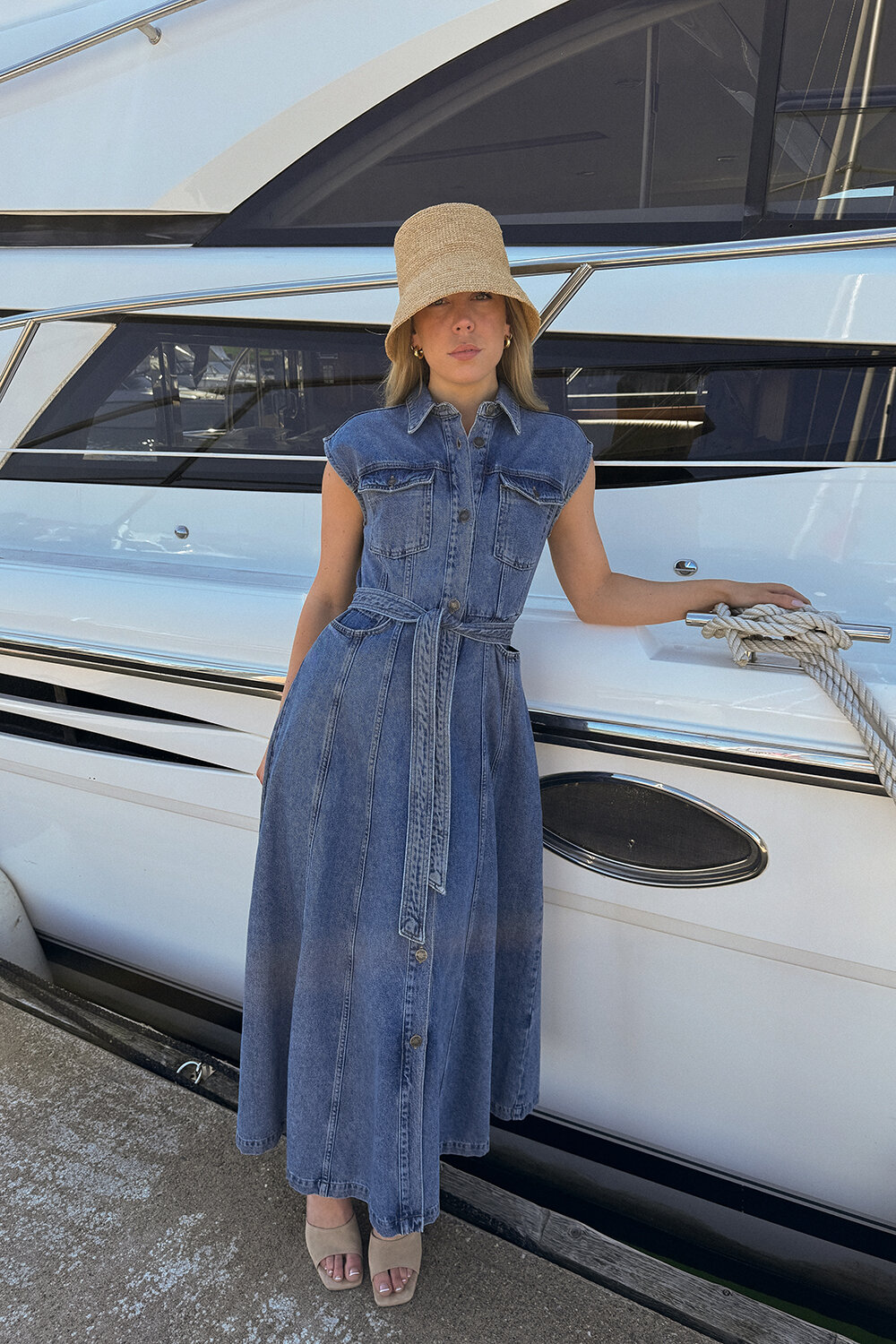 Explore casual chic with the Sinan Denim Dress. Crafted from 100% cotton, it features a sleeveless design, collar, and front button closure. The wider skirt with panels, two chest patch pockets, and a tie waist with belt loops in the back add flair, while two waist pockets enhance functionality.