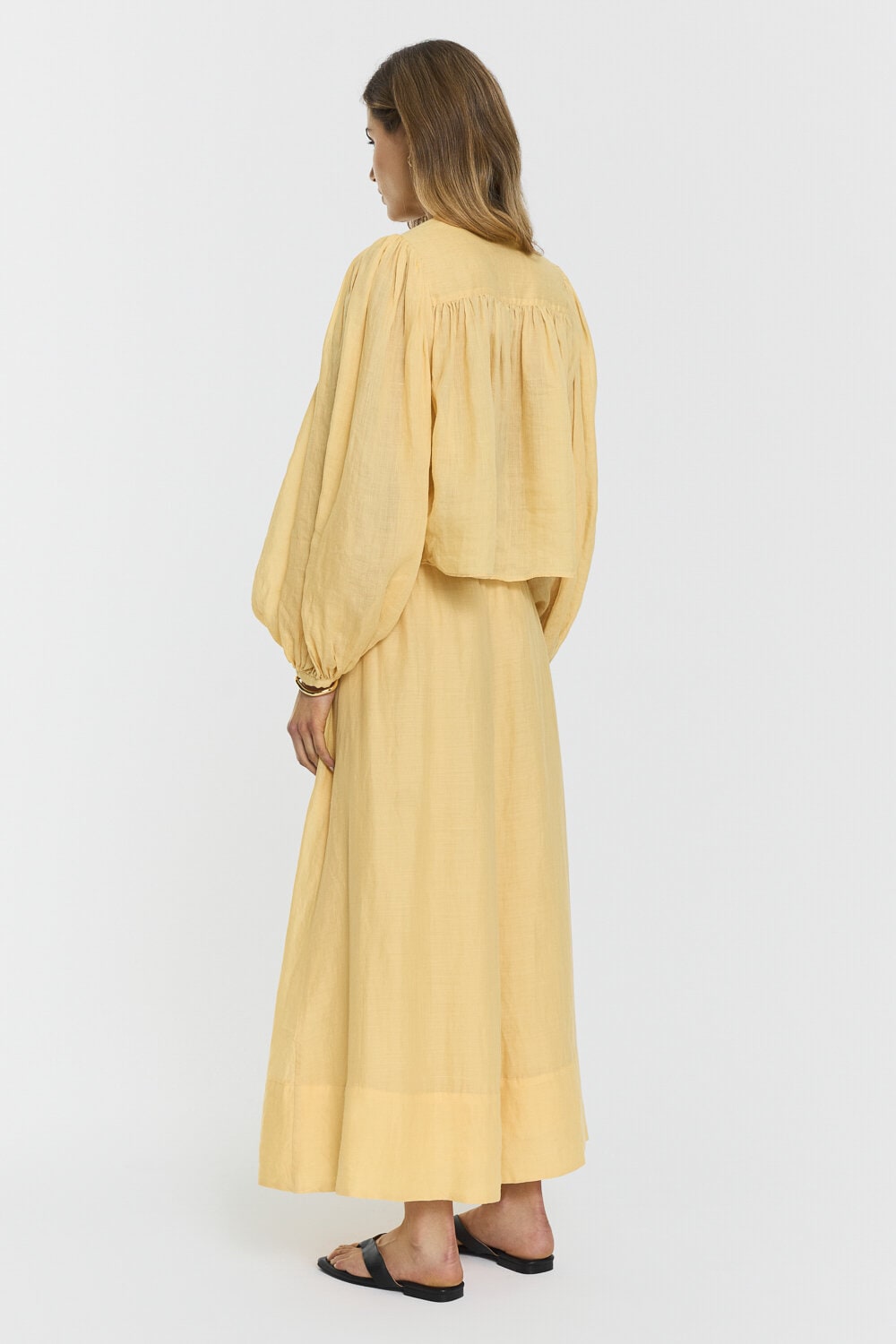 The Leja Blouse features a button-down front with gathered cuffs and delicate pleats at the back. A timeless style that balances soft volume with a refined silhouette.
