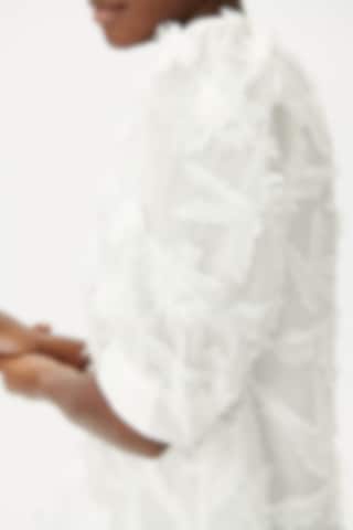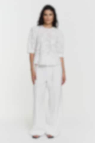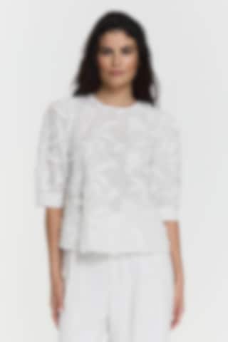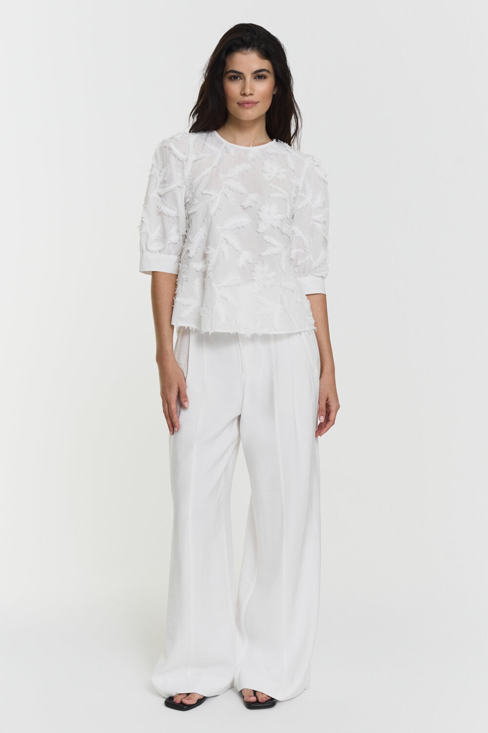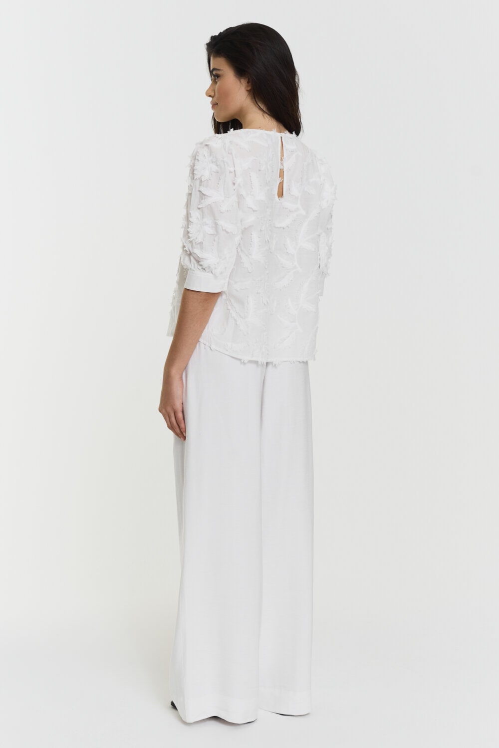 Marla is a blouse in organic cotton with an embroided fringy pattern. It has short puffy sleeves with cuffs and buttons, and opening at back with button. The model is 171 cm and wears size 36.