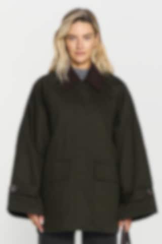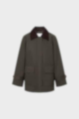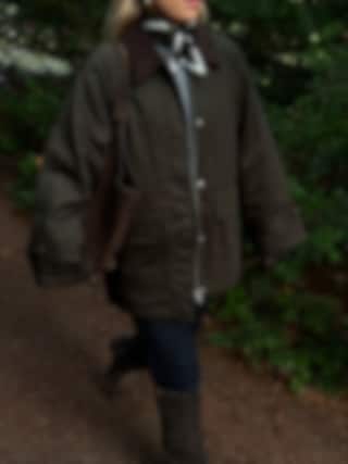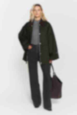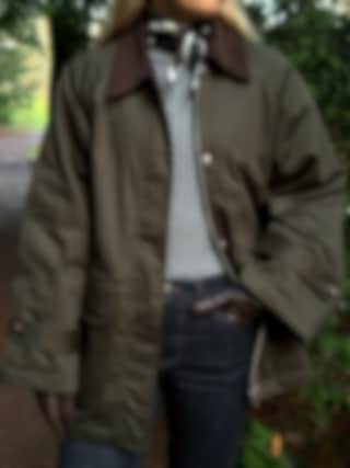 The model is 171 cm tall and wears size S. The Amira Jacket updates the classic barn silhouette with a modern twist. Lightly padded with a quilted lining, it features a corduroy collar, wide adjustable sleeves, zip closure with press buttons, and big flap pockets