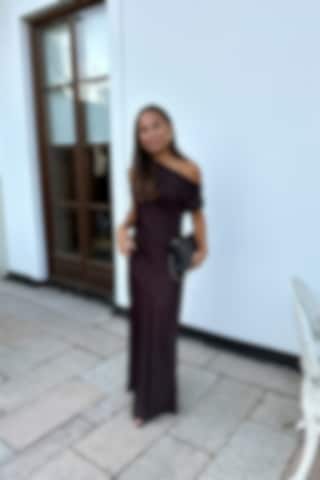 The model is 171 cm tall and wears size 36. The Vanessa Satin Dress features a luxurious satin fabric, elegant cowl neckline, and flattering bias cut. Its maxi length creates a timeless silhouette, perfect for any festivities.
