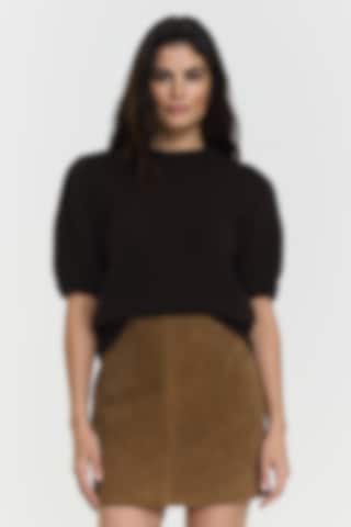The Iris Knitted Top features heavy organic cotton, stylish puff shoulders, short sleeves, and a rounded neckline for a chic, comfortable look. The model is 171 cm and wears size S.