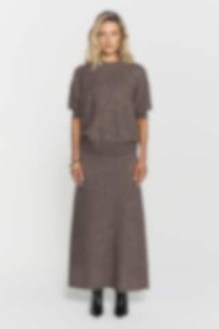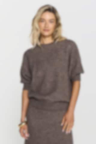 The model is 171 cm tall and wears size S. Introducing our Remi Sweater: Knitted from a luxurious alpaca and merino wool blend, it features puff sleeves with ribbed cuffs, dropped shoulders, and a rounded neckline.