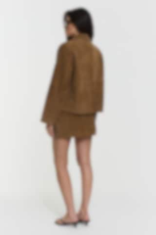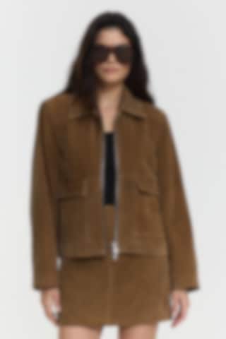 The Minella Jacket is crafted from luxurious rich brown suede, featuring padded sharp shoulders and a zip closure. It includes a flap patch pocket and is fully lined for comfort and style.
