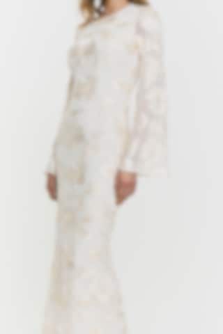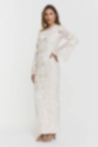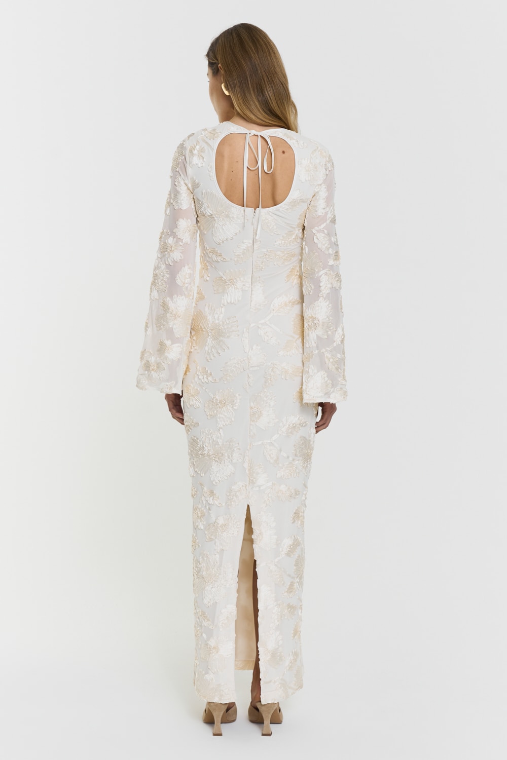 Our Frances Dress, a vision of elegance. Adorned with delicate flower details, this enchanting design features an alluring open back, secured by a hidden zipper and adjustable neck ties for a perfect fit. The maxi length and subtle back slit add a sophisticated finish to the look.