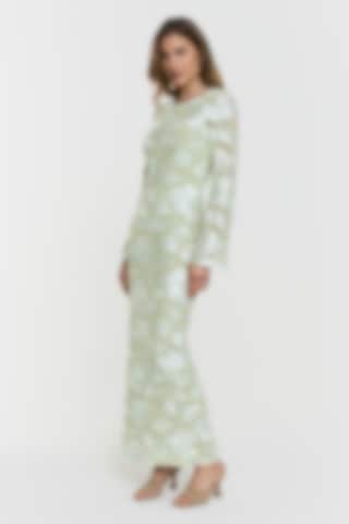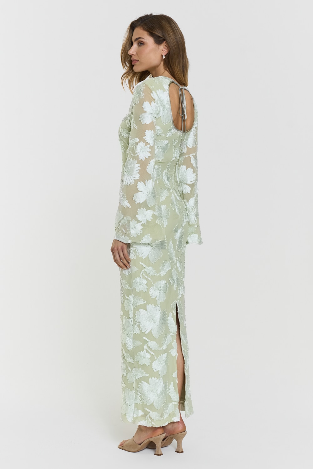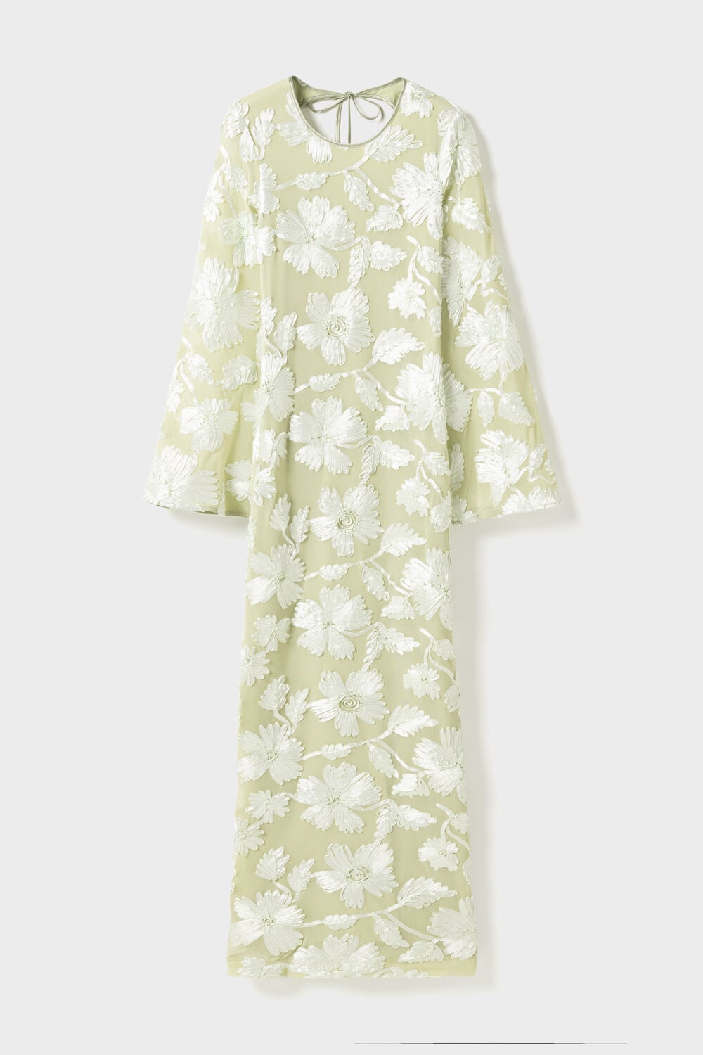 Our Frances Dress, a vision of elegance. Adorned with delicate flower details, this enchanting design features an alluring open back, secured by a hidden zipper and adjustable neck ties for a perfect fit. The maxi length and subtle back slit add a sophisticated finish to the look.