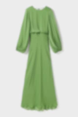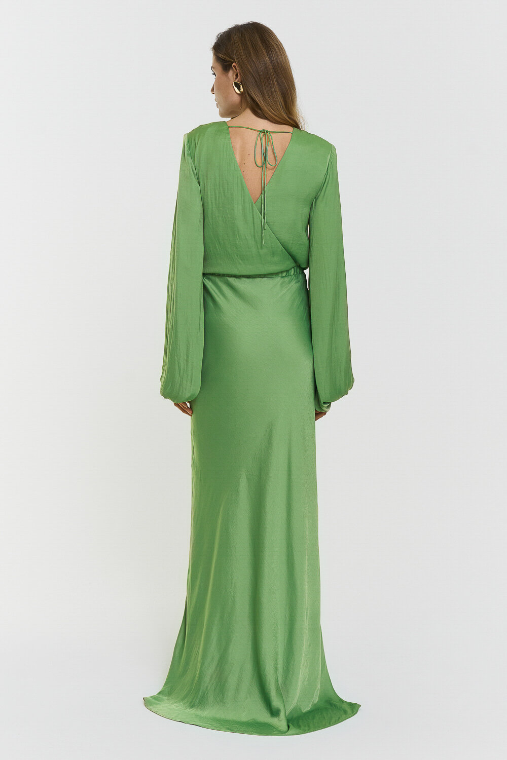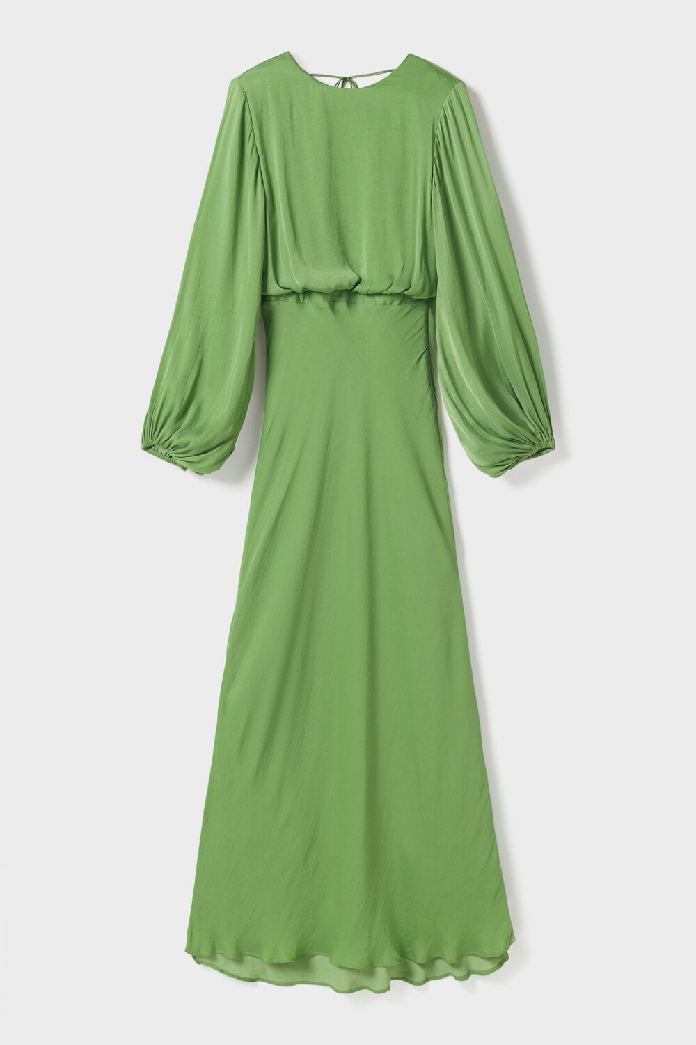 Note: This style has a longer fit and was designed with extra length. The Juliette Dress is designed in a fluid fabric with a graceful maxi silhouette. It features balloon sleeves with elastic cuffs, an overlapping back with a delicate tie at the neck, an elastic panel at the back, and a hidden zip. Fully lined for a refined finish.