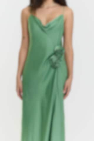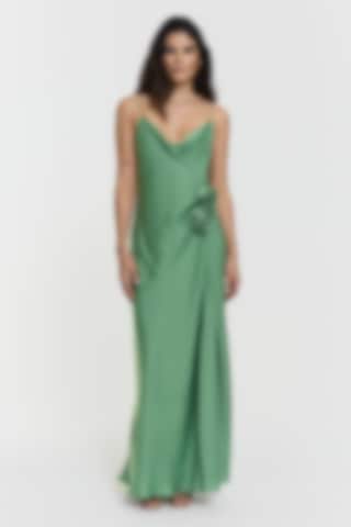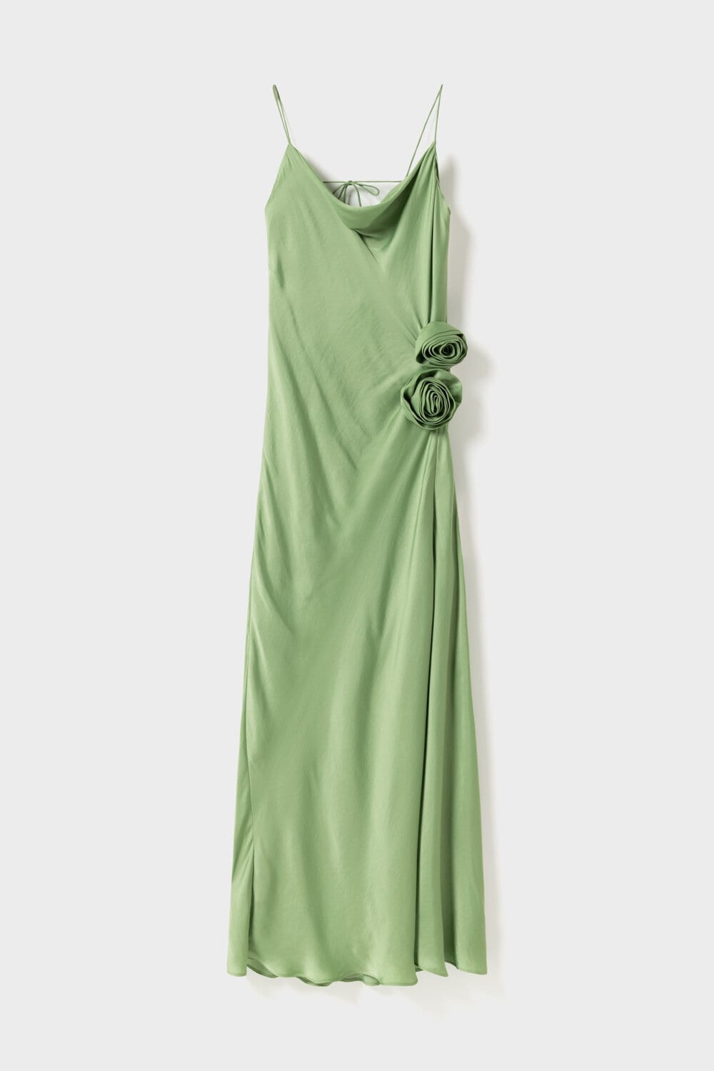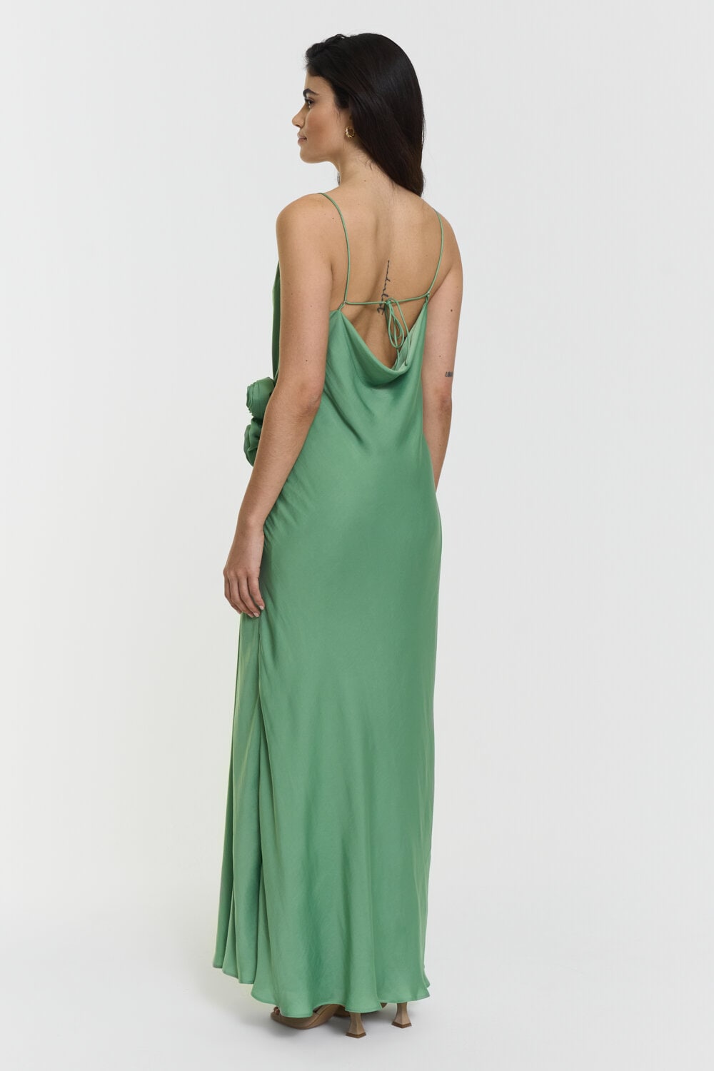 This stunning Lojsan Dress is crafted from reycled polyester with a flattering cowl neck and two elegant roses in the front. Featuing adjustable shoulder straps, a fully lined maxi length, and a flawless low back for effortless elegance.
