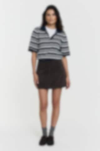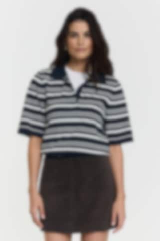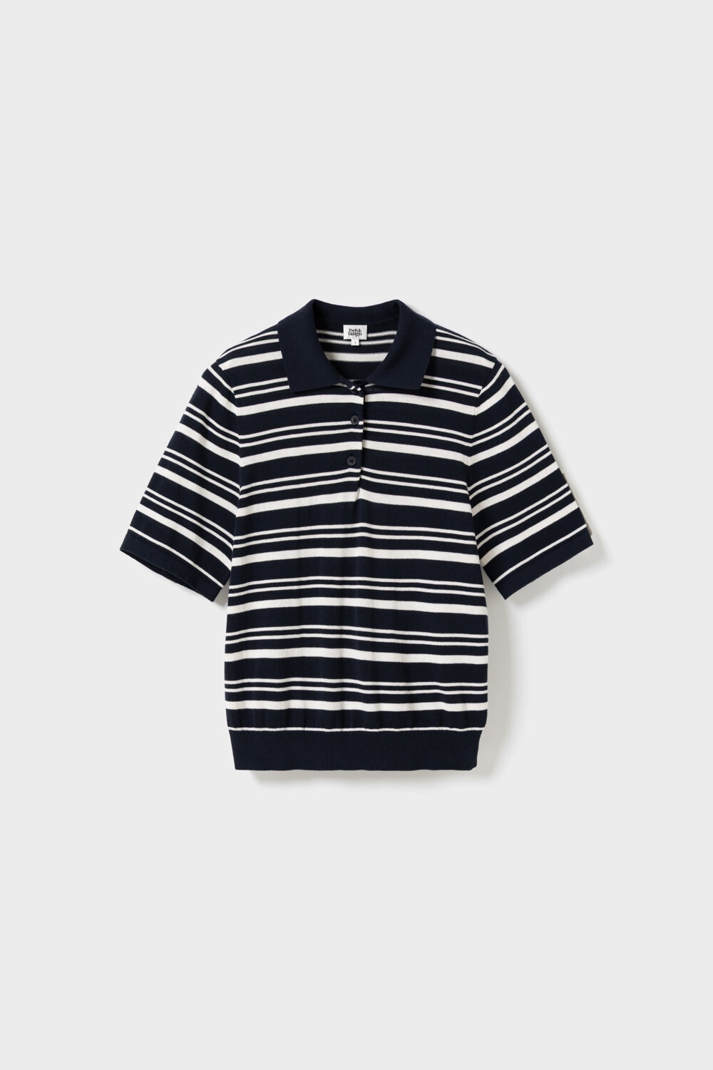 The Leonelle Polo Knit Jumper features a navy and white striped design with a classic collar and short sleeves. Knitted in a soft cotton, it offers a smooth, lightweight feel with a refined, modern expression.